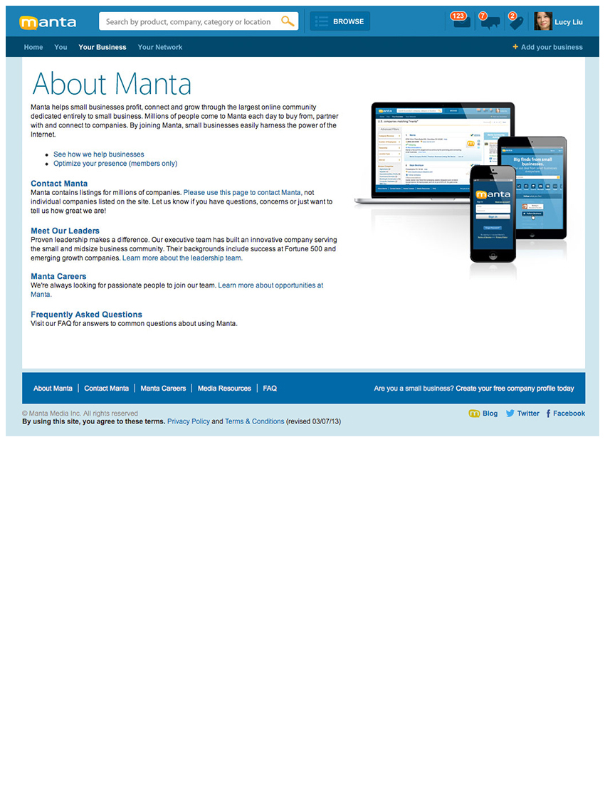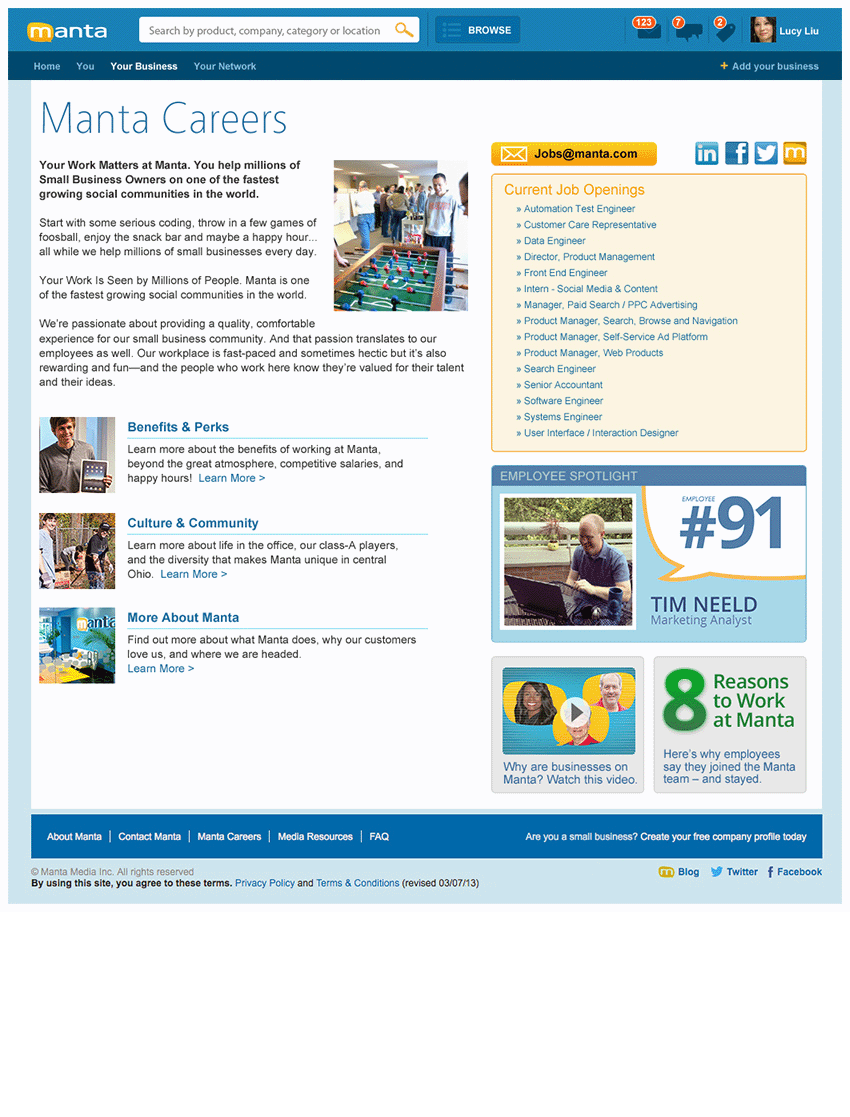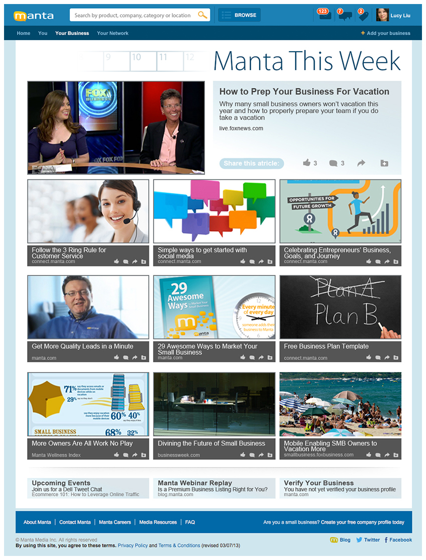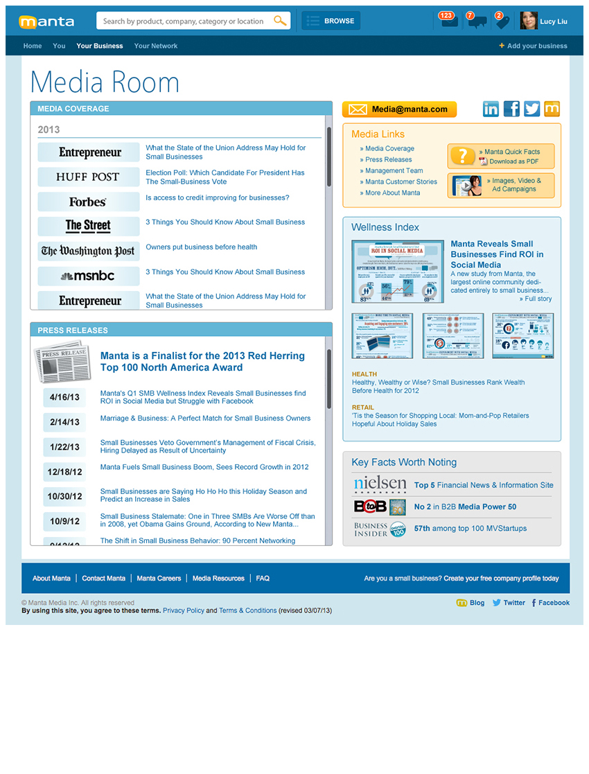 Working hand-in-hand with the Marketing team, created new “Manta This Week” interface, “Small Business Expertise” with DELL & Intel, “The Pulse” full page design in partnership with FOX Small Business, as well as the Small Business User Interface, About, Media Room, Contact, and Careers/Culture/Reasons to Work Here/Benefits & Perks/Culture & Community pages. Manta homepage redesign exploration created with UI/UX Design Team; all work done as a Junior Designer.