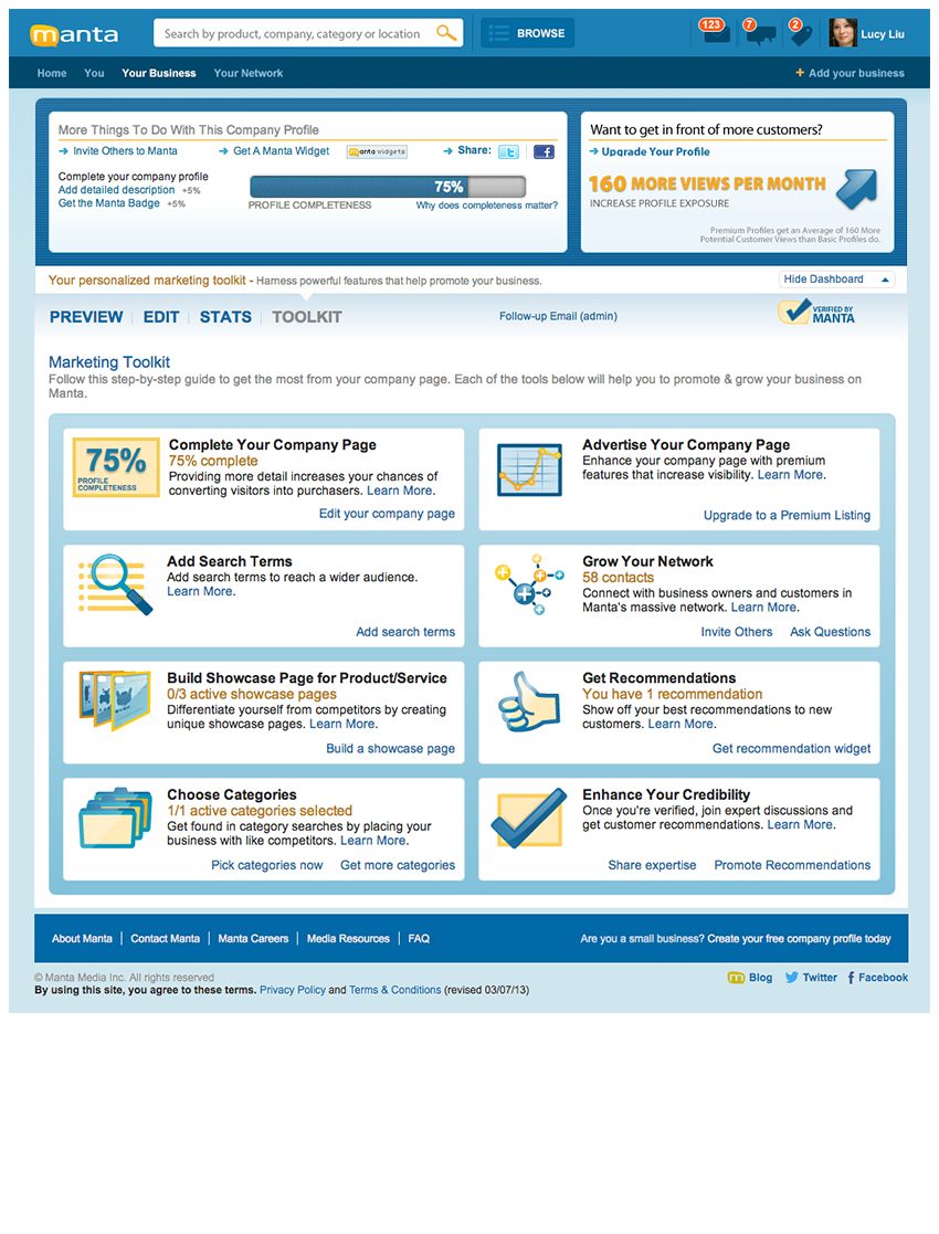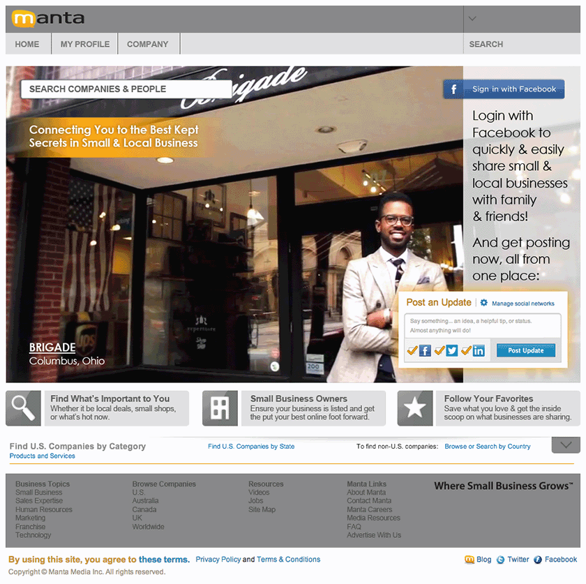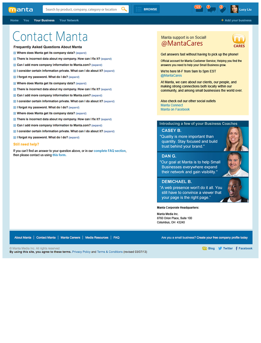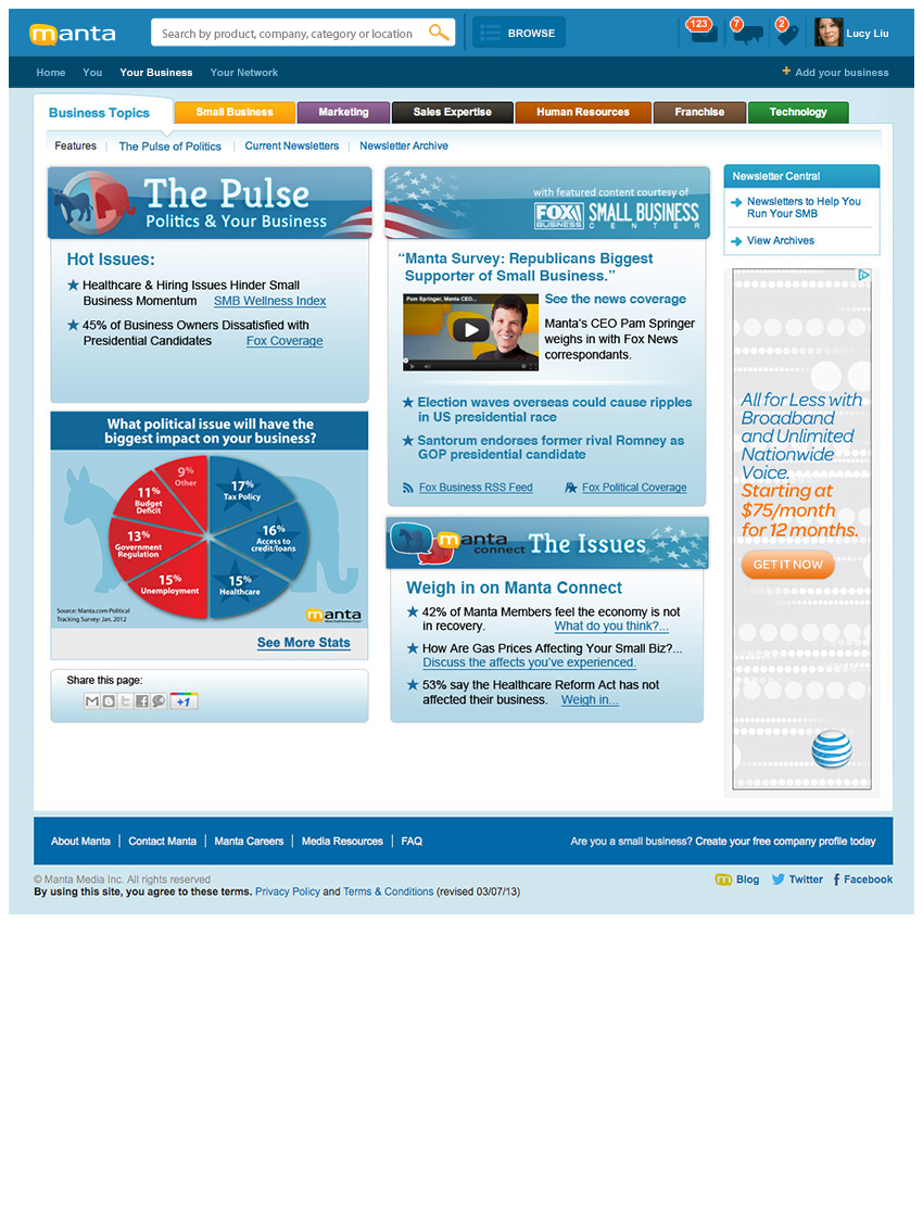 Working hand-in-hand with the Marketing team, created new “Manta This Week” interface, “Small Business Expertise” with DELL & Intel, “The Pulse” full page design in partnership with FOX Small Business, as well as the Small Business User Interface, About, Media Room, Contact, and Careers/Culture/Reasons to Work Here/Benefits & Perks/Culture & Community pages. Manta homepage redesign exploration created with UI/UX Design Team; all work done as a Junior Designer.